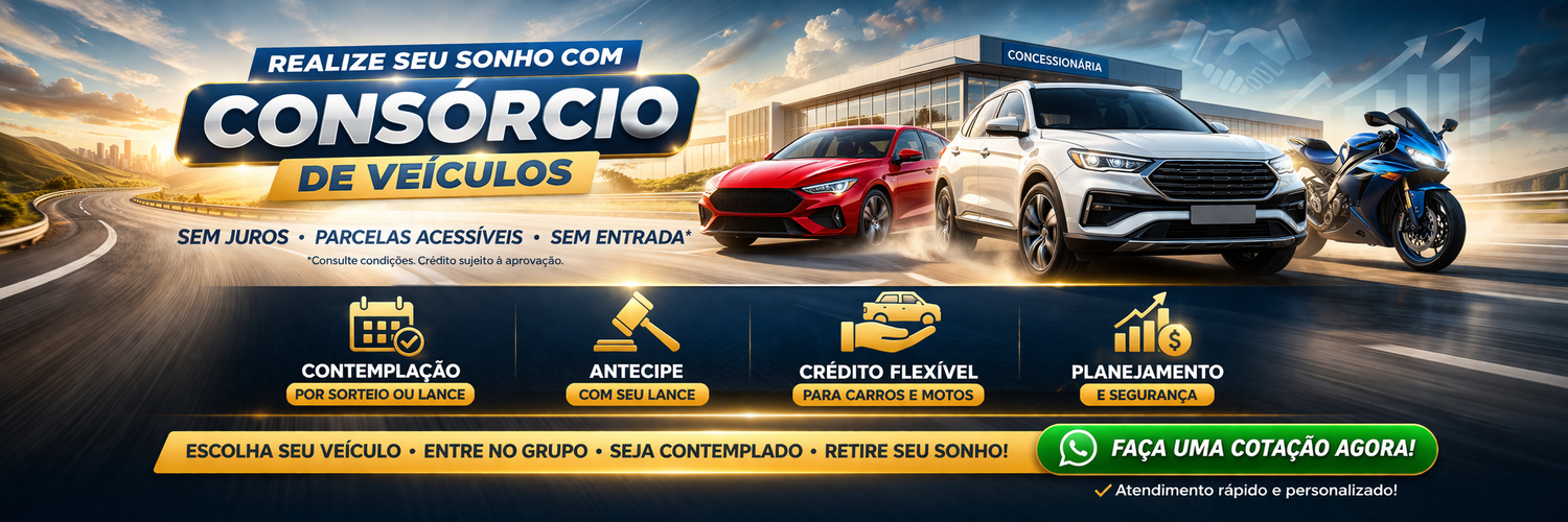 O consórcio de veículos é a forma mais inteligente, econômica e planejada de conquistar seu carro, moto ou utilitário, sem juros e com parcelas acessíveis.